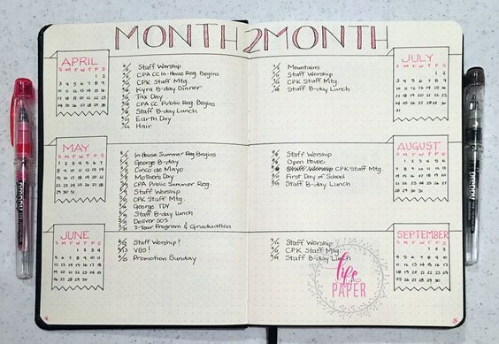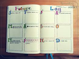 Pour en revenir au futur log, voici d’autres exemples. Beaucoup mettent 6 mois sur une page et non 4. Cela dépend de ce que vous souhaitez inscrire dedans, et de votre présentation … Si vous n’avez que peu d’informations à y écrire, il est peut être plus intéressant de faire 6 mois et non 4. A l’inverse, si vous avez beaucoup de tâches, rendez-vous à inscrire pensez à ne faire que 3, 2 voir 1 mois par page. A vous de voir ! Mais dans ce cas, je vous invite à vous reporter ci-dessous dans la partie Free style !