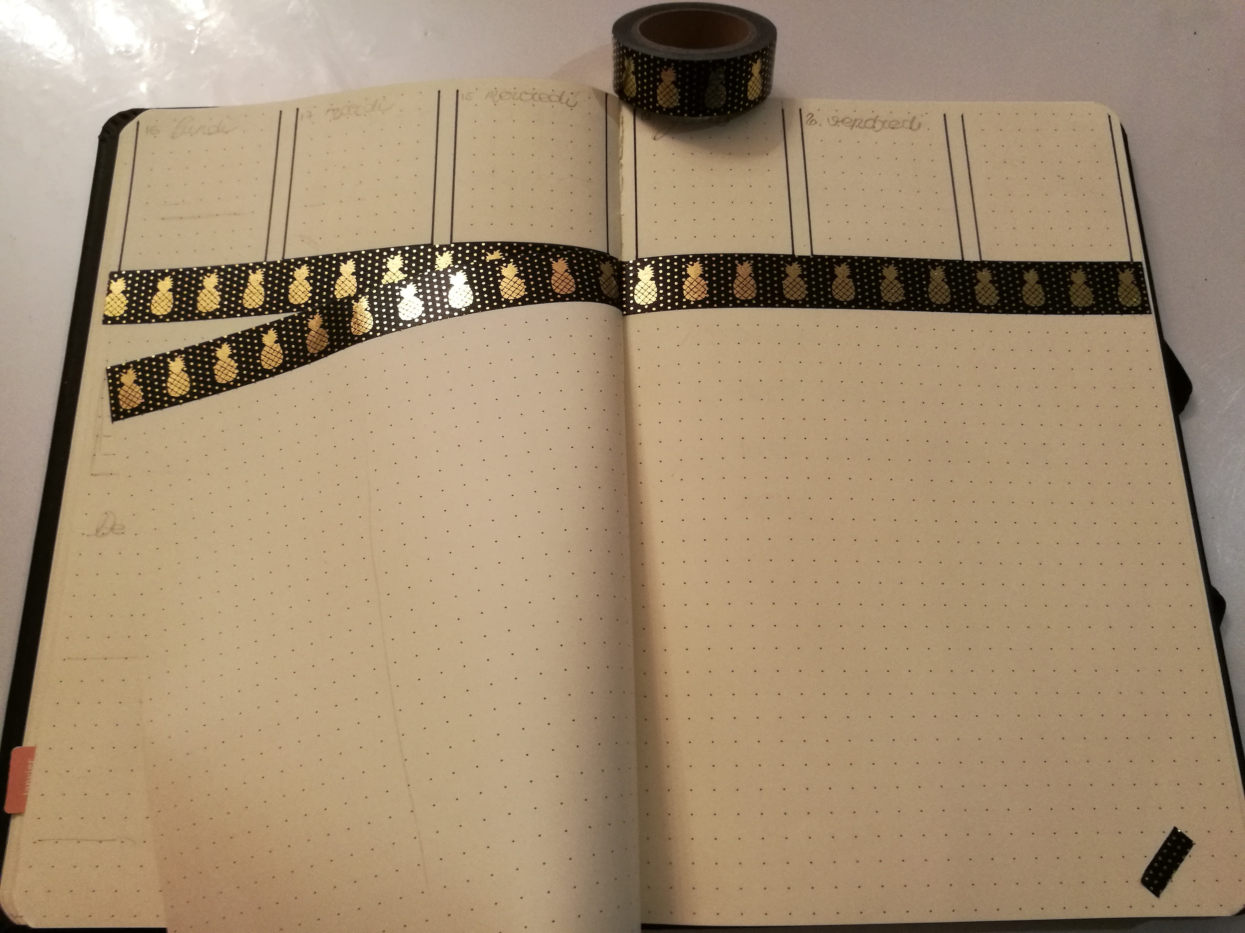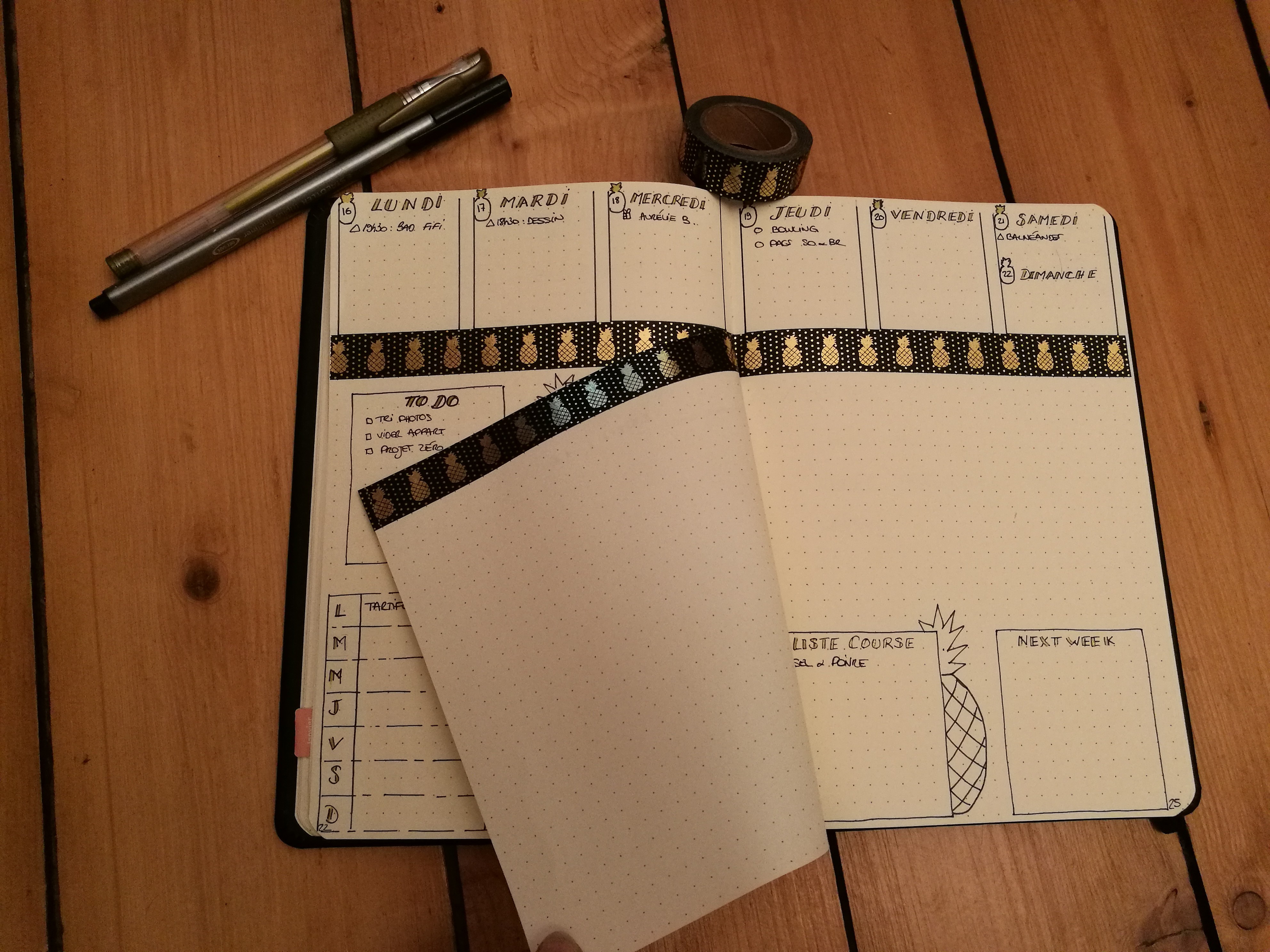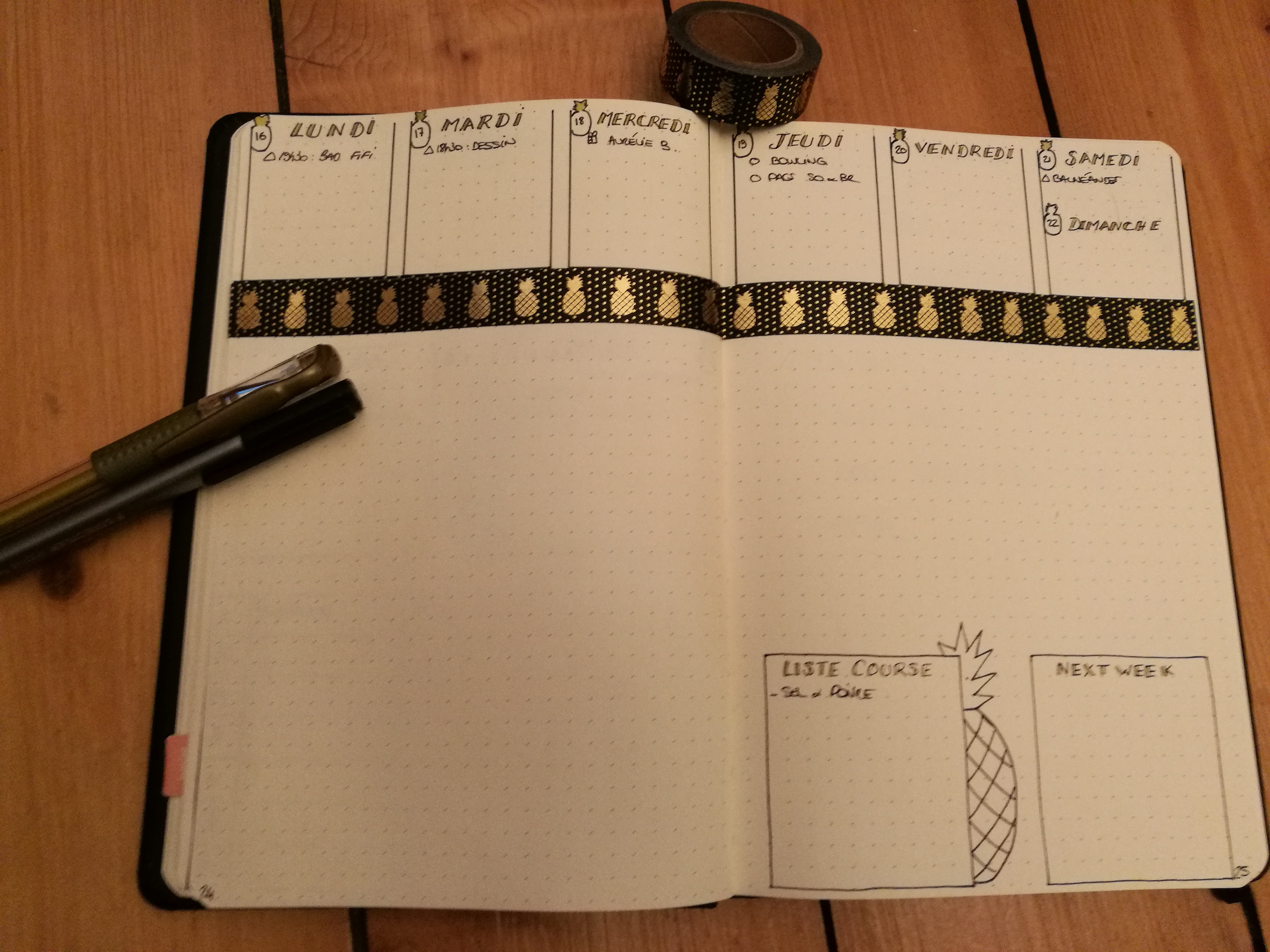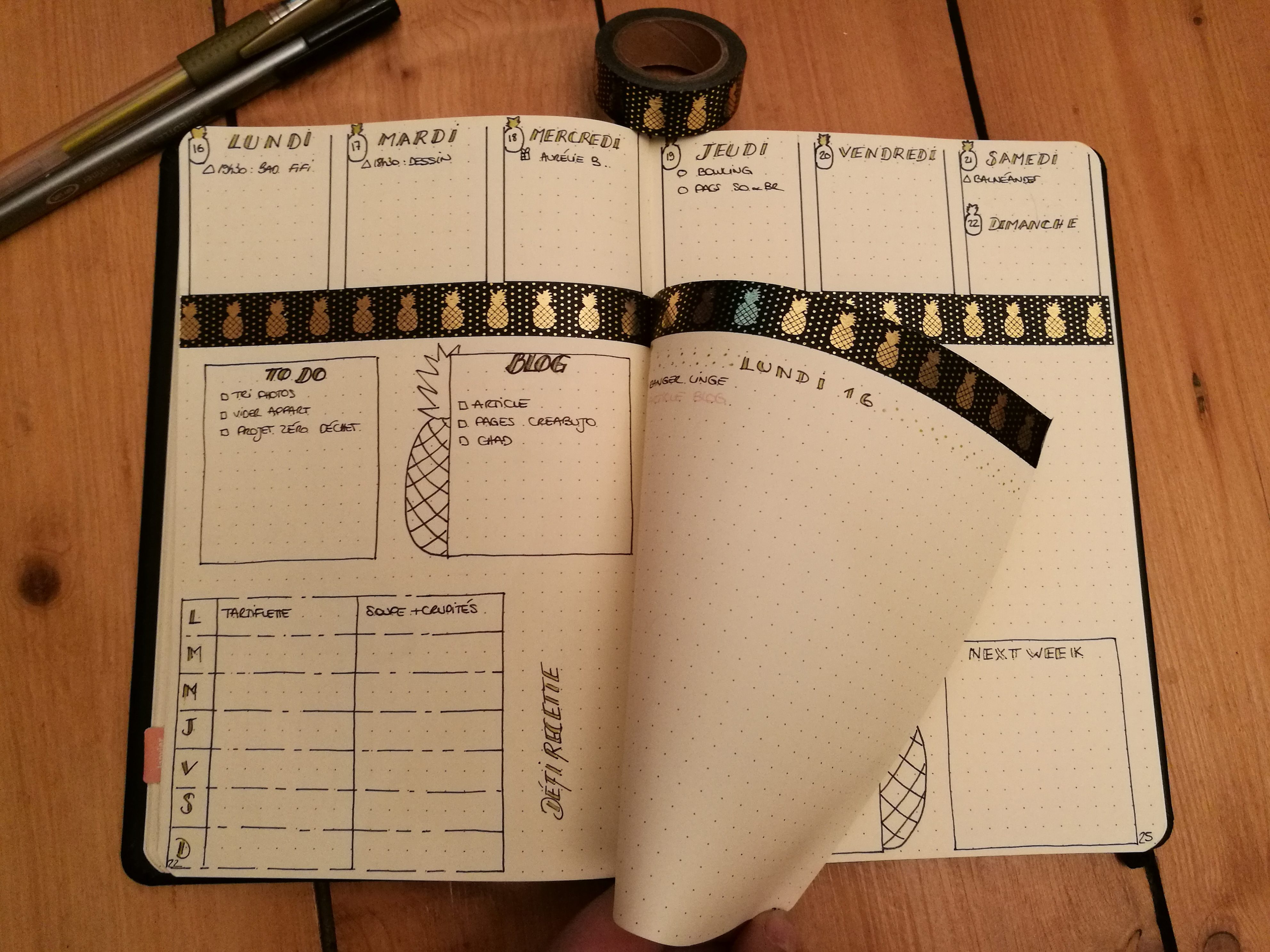 Pour la première, j’utilisais alors le carnet Rhodia Webnotebook. Un joli carnet que j’ai adoré utilisé. Puis pour les ananas il s’agit de ce Masking tape. Pour ce qui est des stylos, le doré c’est Signo or de Uniball. Pour le stylo noir c’est un Pigment liner 0.3 de Staedtler. S